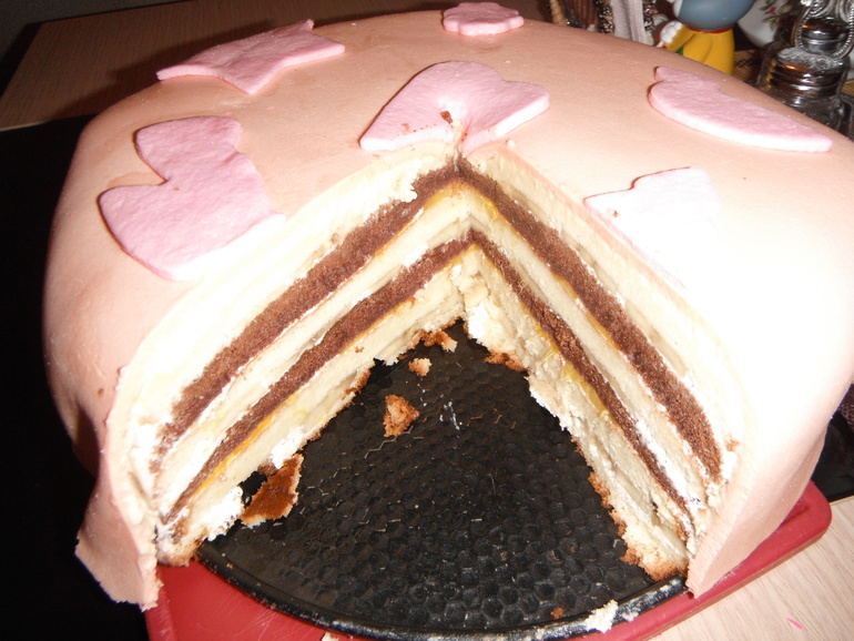 Каждый бисквит пропитываем сиропом от консервированных фруктов. Слои смазывала поочередно: взбитые сливки 33 % c сахарной пудрой, слой с бананами, слой с консервированными фруктами. Вариантов много, экспериментируйте.