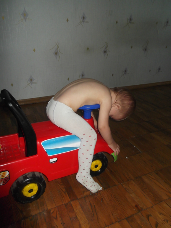 забрали от родителей нашу машину-каталку, теперь яська с нее не слезает, требует катать ее день и ночь, когда никто не катает толкает ее сама..сегодня с утра я ее катала катала, ну она устала и уснула)) на три часа раньше положенного