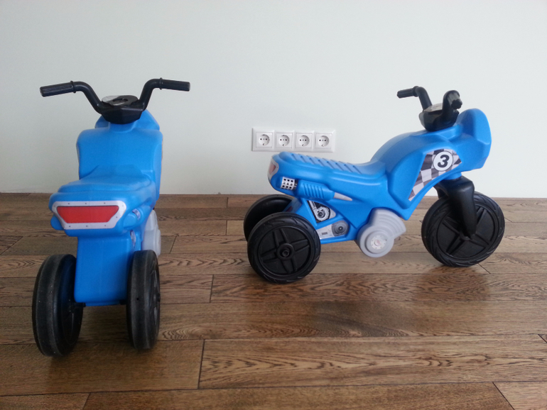 Беговелы: производство Польша. Очень легкие. Все из пластика. Колеса прочные. Ничего не открывается и не звенит. Начинали кататься с роста 80см.