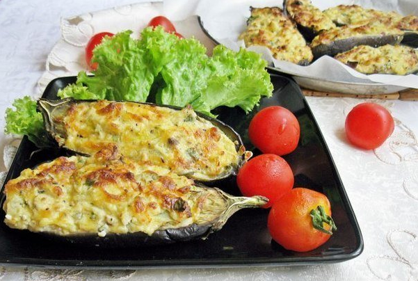 4. Застелите противень для запекания пергаментной бумагой. Подготовленные баклажаны-лодочки нафаршируйте начинкой.