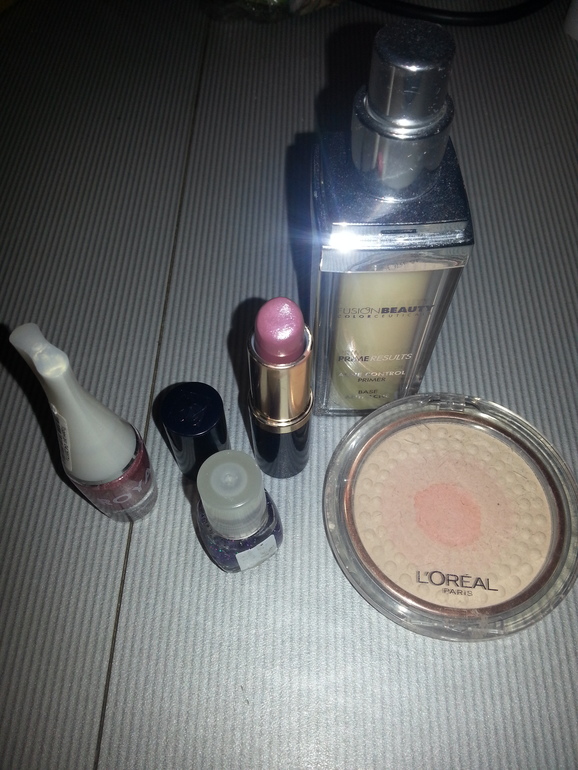 Помада Эсте Лаудер (б/у на руке, цает не мой), большой лак новый (с блестками), маленький б/у, база под макияж, пудра с блестками б/у кистью пару раз (мне бледная)