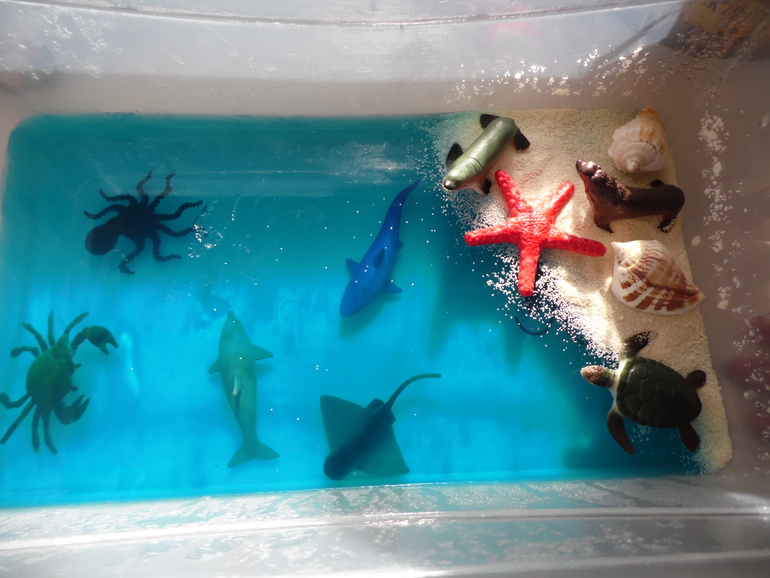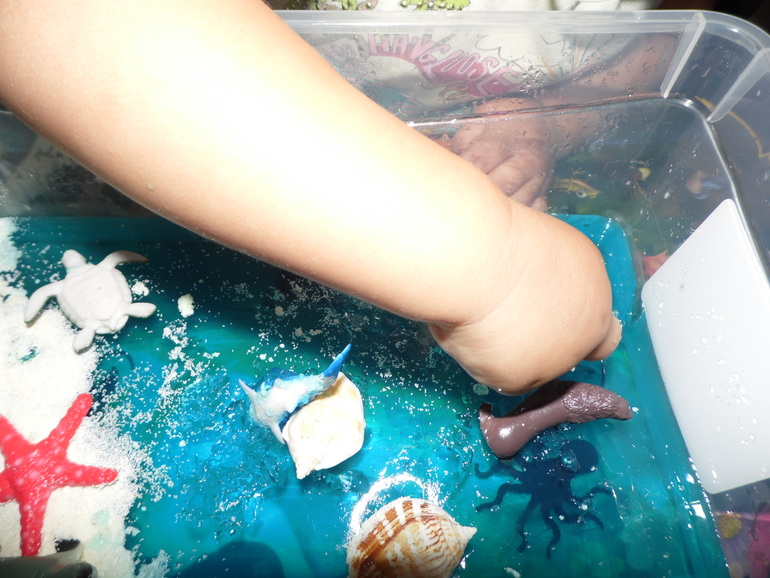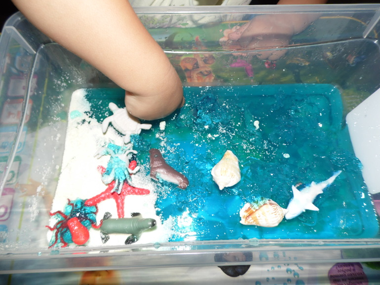 Сделала вот такую сенсорную коробочку, так сказать "Океан в коробке" идею брала Тут очень понравилось решила воплотить . Скажем так смотрится красиво но играть дочке не очень понравилось. Так как после доставания рыбок желе стало рыхлым и дочка просила вымыть ей ручки. Больше ей понравилось рассыпать манку по поверхности. Остальные фото под кат