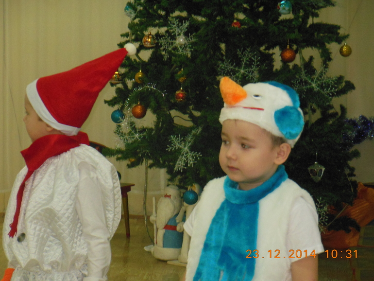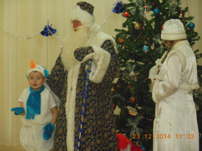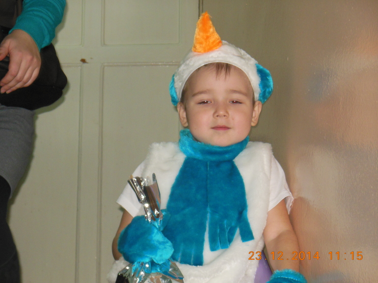 был сегодня в садике.Бабушка не могла пропустить такое мероприятие.Михась немного приболел-похоже ротовирус.Три дня был дома с папой.Сегодня уже чувствовал себя хорошо.Сначала был немного зажат,а потом развеселился.Он был снеговиком.Ребяткам было весело.Коллектив воспитателей постарался.А Дед Мороз был такой классный,да и снегурочка зажигалочка.После утренника внук решил,что поедет с папой домой.Папа же отпуск догуливает.
