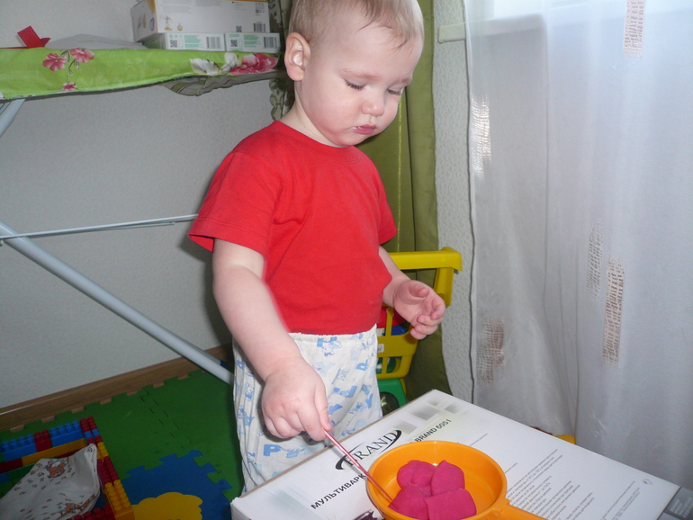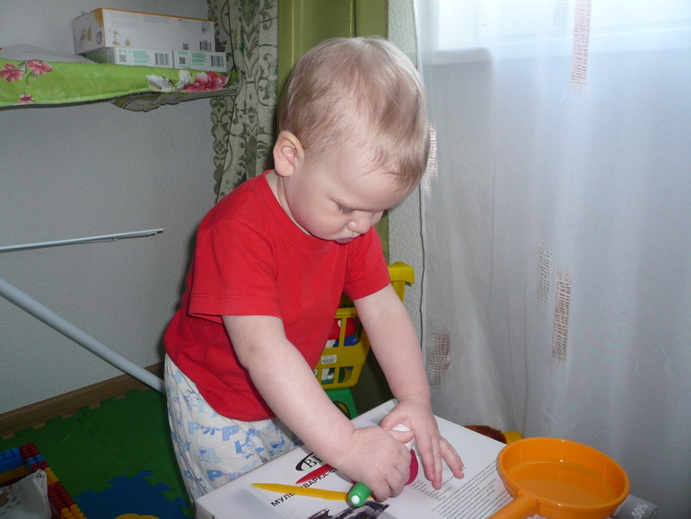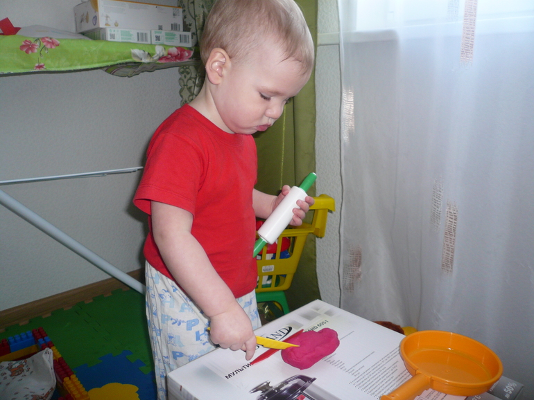 Еще мы играли в пальчиковые игры, слушали музыку. С печатными заданиями пока ничего не получается. Алеша или вообще не смотрит , что я показываю, или если и сядет, посмотрит, но видимо не понимает, что надо делать, все разбрасывает. Попробовали только дорожки ( проводили пальчиком). Тарелки по размеру тоже не получилось разложить, накладывает их друг на друга, видимо думает, что лото.