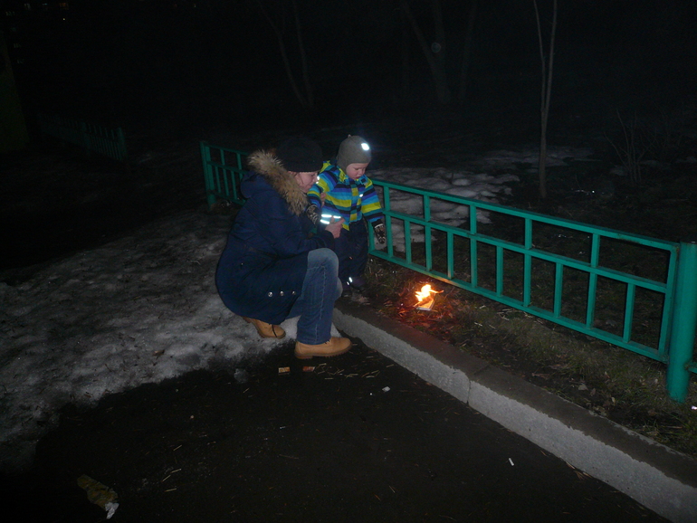 Делали шумелку и потом прогоняли зиму. Мы так шумели, что , наверно, испугали не только зиму, но и всех соседей. Когда я начала бренчать по кастрюле и кричать: Зима, уходи!!!, Алеша посмотрел на меня, как на ненормальную , с недоумением , но потом сам с удовольствием побренчал.