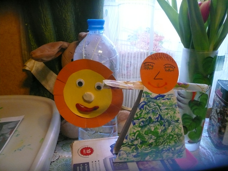 Делали чучело Масленицы. Алеша мазал клеем голову, которую я заранее сделала и вместе приклеили, и он разрисовал ватной палочкой.