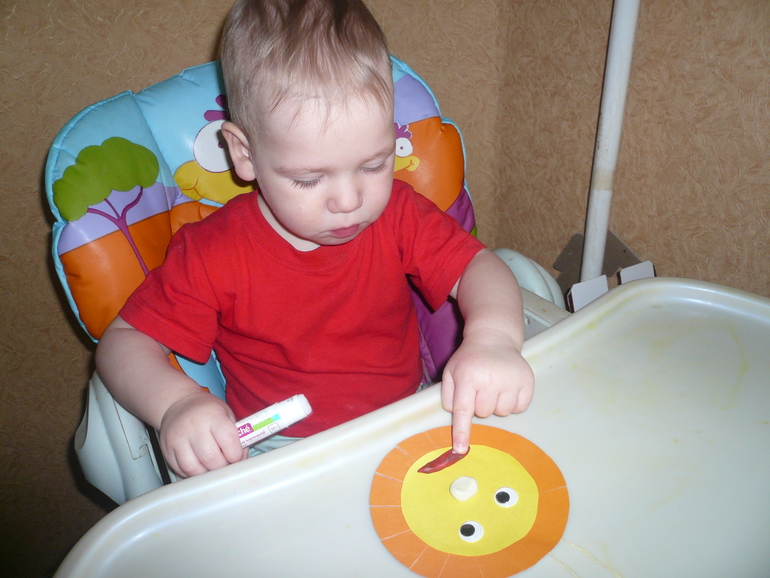 Еще решили сделать солнышко. Попытались порезать ножницами лучики, но пока ничего не получилось, слишком мал еще. Поэтому, Алеша сделал, что уже немного умеет: мазал клеем второй круг, приклеил, вместе скатали из пластилина колобок и колбаску (уже лучше получается), приделал нос и рот, я приклеила глаза. Вот что у нас получилось.