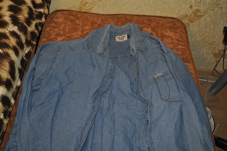 Мужское, размер 54, на рост 176 и на животик. Джинсовая рубашка и серый полувер на рост 180