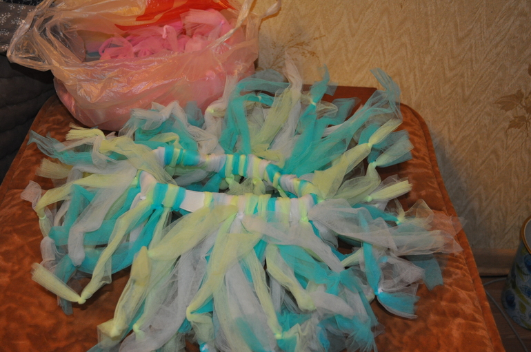 Юбка из ленточек (примерно от 2 до 4 лет, у дочери рост 122, попу уже не прикрывает, ей совсем мало), ленточки развязываются, в пакете розовые и желтые, я снимала в свое время, меняла расцветку)