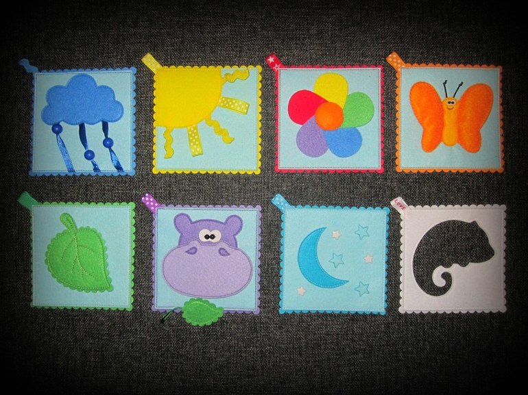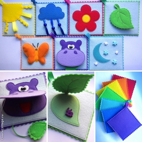Вот такая книжечка сшилась для игры "Раздача слоненят". Размер: 10х10см. Обратная сторона карточек - однотонный фетр по цветам радуги. Каждая аппликация соответствует цвету на обратной стороне.