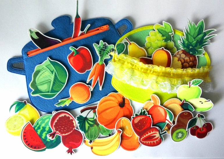 Всеми любимая тема: "Урожай"))) Все очень просто: фрукты собираем в корзину, а из овощей варим суп/борщ)