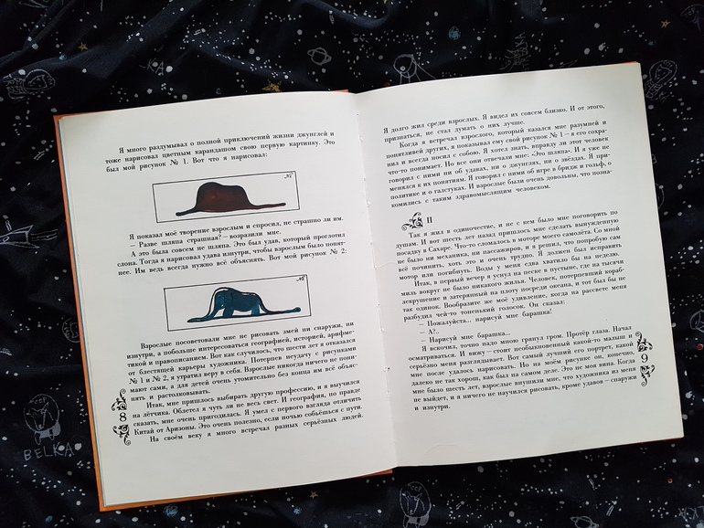 "Взрослые посоветовали мне не рисовать змей ни снаружи, ни изнутри, а побольше интересоваться географией, историей, арифметикой и правописанием. Вот как случилось, что шести лет я отказался от блестящей карьеры художника. Потерпев неудачу с рисунками №1 и №2, я утратил веру в себя. Взрослые никогда ничего не понимают сами, а для детей очень утомительно без конца им все объяснять и растолковывать"