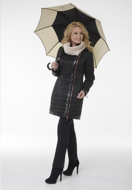 Двубортное пальто полуприлегающего силуэта, на синтетическом утеплителе Термокомфорт-160, расстрочено в актуальном европейском стиле, комбинированное с плащевой тканью и отделкой из эко-кожи по переднему борту, низу изделия и рукава. Передний борт и рукава изделия декорированы молнией, цвета розовое золото. Дополнительным аксессуаром является шарф-снуд из мягкой шерстяной ткани.