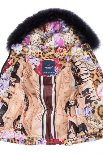 Куртка: с двойным пуховым пакетом, прилегающего силуета, что позволяет носить комплект даже в самые сильные морозы, воротник куртки - стойка. Капюшон съемный, пристегивается на молнию с регулируемой кулисой. Зимняя куртка для девочки застегивается на открытую молнию тесьму с ветрозащитной нижней планкой. Рукав - втачной, его можно изменять по длине отворотными манжетами. Манжеты дополнены внутренними трикотажными напульсниками для защиты от ветра. Перед куртки, спинка и рукава простеганы горизонтальными переборками на резинках. На передней части куртки два прорезных боковых кармана.