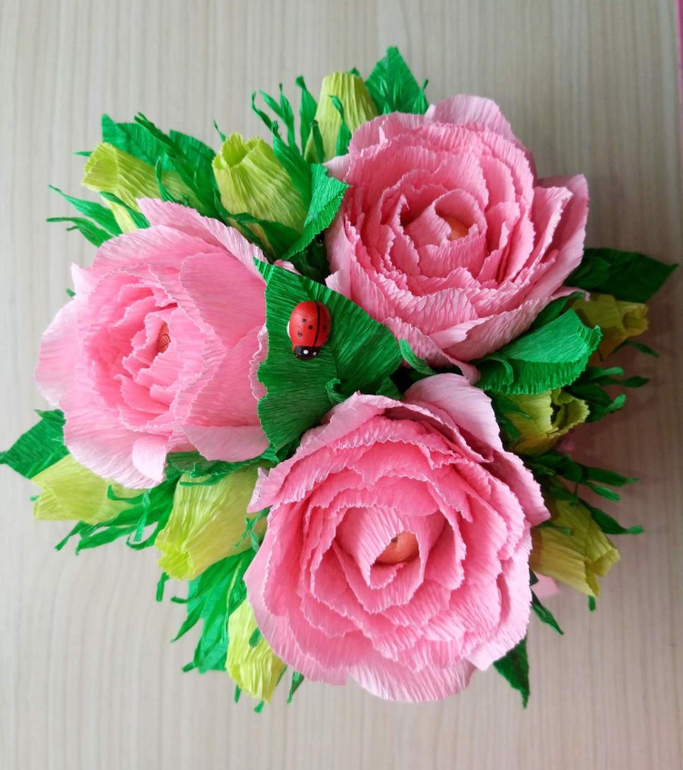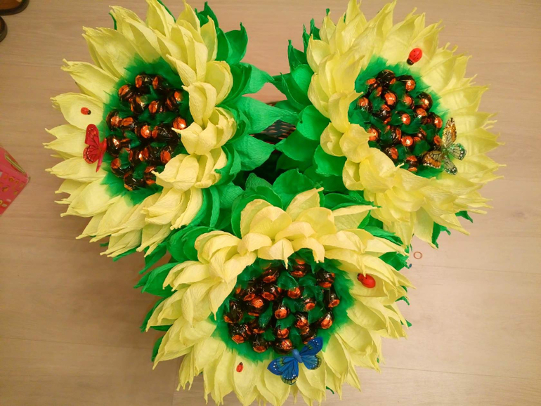 Внутри роз и бутонов находятся шоколадные конфеты, вытаскиваются легко. 600-650