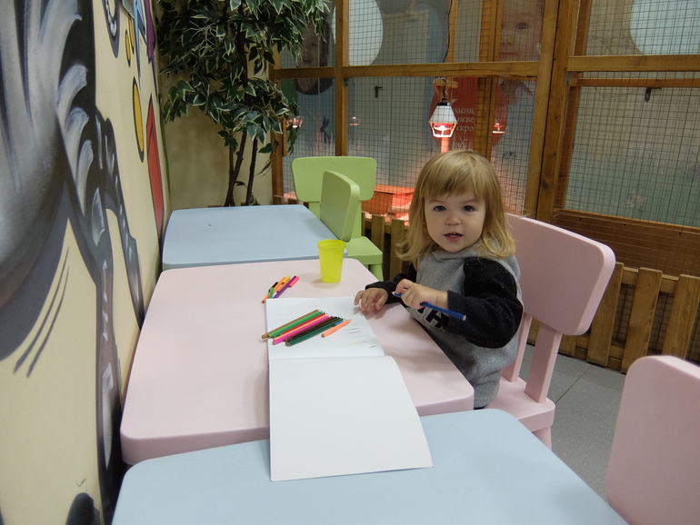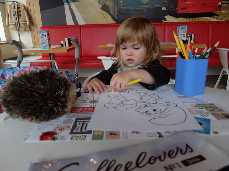 Из зоопарка мы унесли с собой маленького ёжика и закончили нашу прогулку походом в кафе, где Уля тоже порисовала в ожидании своего сладкого блинчика.