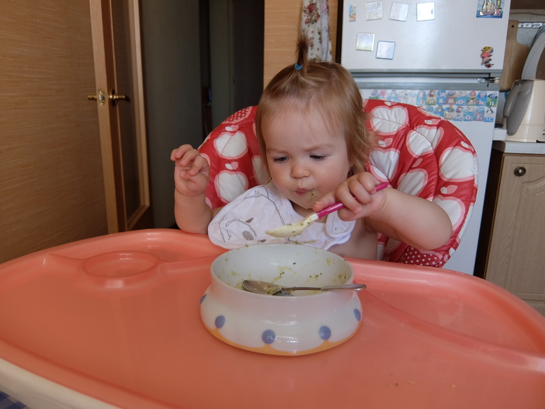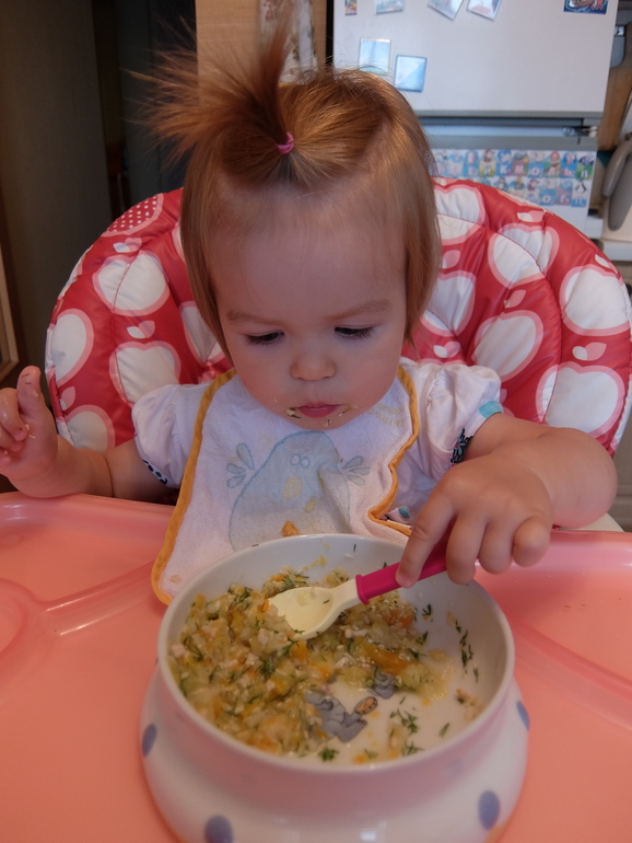 ...рагу из брокколи и кабачка. Плюс курочка и желток. Ульяна просто набросилась на это кушанье. А мама спохватилась и сделала фото, когда тарелка уже была почти пуста.
