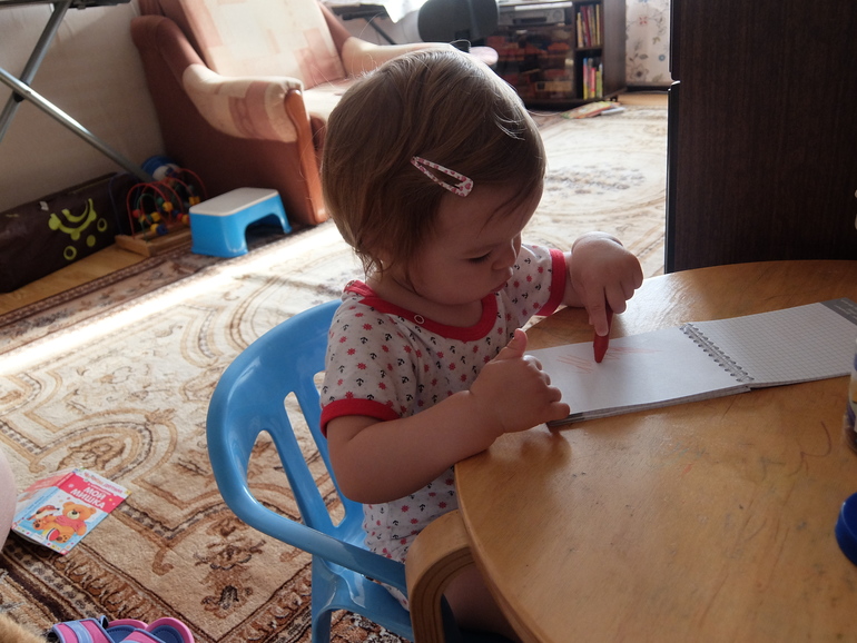 Калякаем понемногу. Ульяна то в правую ручку карандаш берёт, то в левую. Но в левую чаще, и ей явно удобнее.
