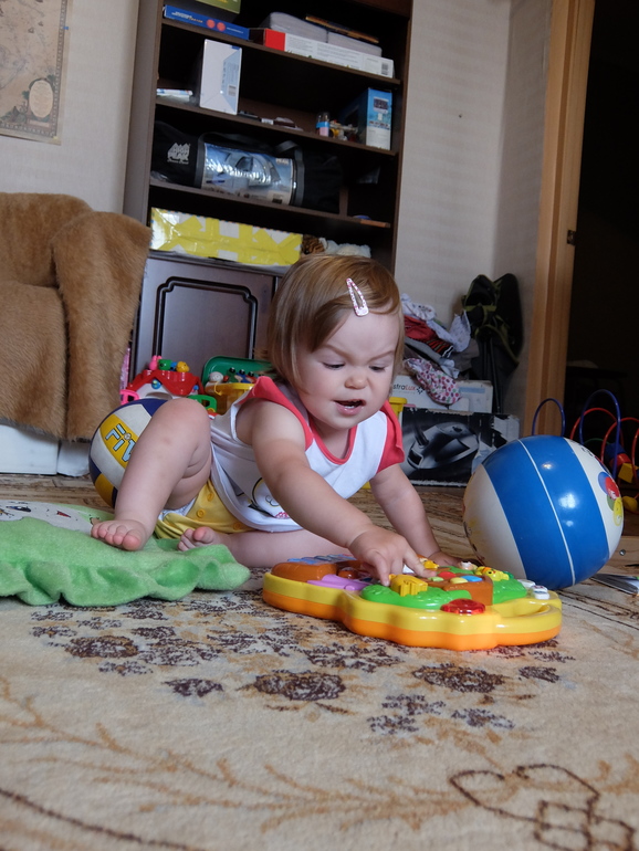 Стала мало спать днём: всего-то 1,5 часа. Очень неудобно, т.к. я не успеваю нормально поработать, и потом приходится сидеть за компом уже рядом с ней играющей.