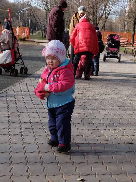 На улице мы по-прежнему не ловим никакого кайфа от прогулок. Иногда Ульяна начинает орать сразу же, как только мы приближаемся к детской площадке. Мы поменяли комбинезон. Я вижу, что ей легко в нём двигаться. Но... ей неинтересно. Жду зиму. Копать большой лопаткой, лепить снежки и снеговиков - может быть, это разукрасит наши прогулки.