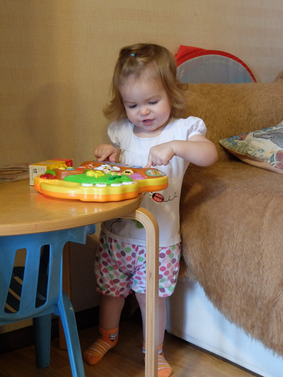 После улицы может час увлечённо играть одна. Стала спокойнее чувствовать себя одна в комнате, если я готовлю еду, например, на кухне. Уже перестала требовать моего постоянного присутствия рядом.