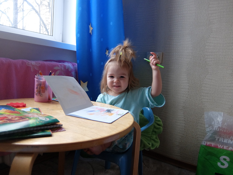 Увлечённо играет с детской посудкой. Очень много рисует в альбоме. Стала рисовать и в книжках. Объясняем, что нельзя. Но нет-нет - да какая-нибудь книжка вновь оказывается искаляканной. Купили ей простенькие раскраски - пусть калякает в них. Ей нравится малевать не на белых местах, а прямо на персонажах. Раскраски как раз для этого подходят.