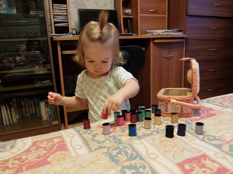 Обожает все девчачьи занятия: перебирать катушки с ниточками, бусики, сумочки, тряпочки, детскую посудку, взрослую посудку (конечно, ту, которую ей дают перебирать).
