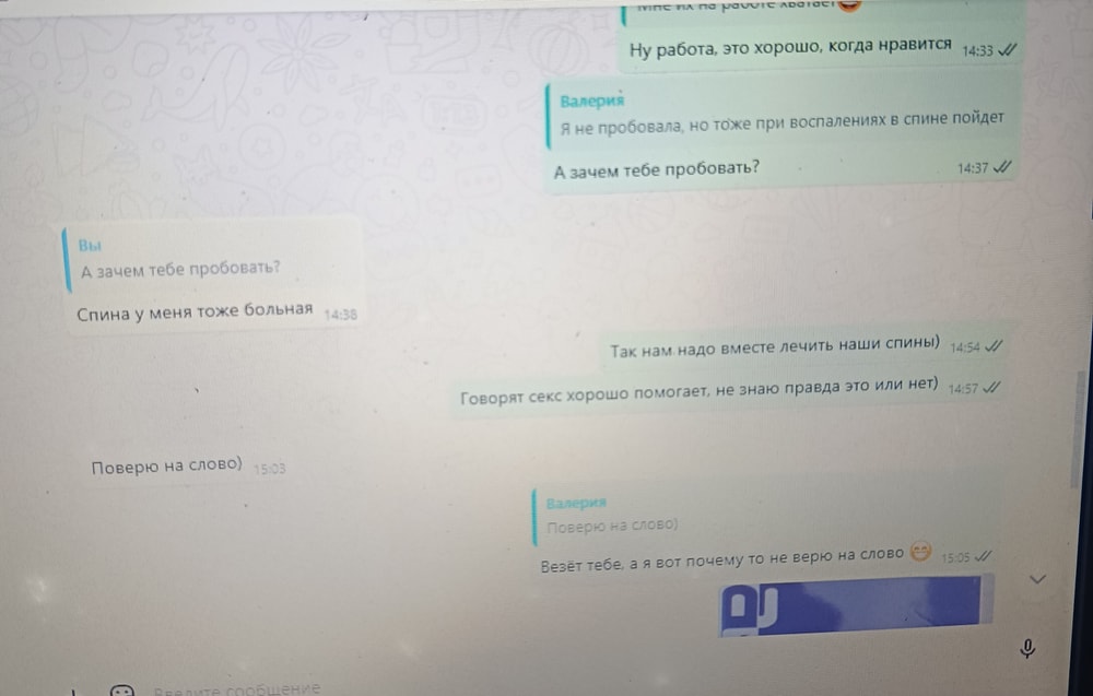 Случайно увидела у него в тел. сообщение "Доброе утро" от какой то Валерии. Не обратила внимание, тк ему по работе много пишут. Еще и пошутила мол Валерия ответ ждет.Через примерно неделю, опять в выплывающих такое смс увидела.И больше ничего. Я уже насторожилась, мы были на отдыхе и телефон в этот момент был у меня в руках. Я ей ответила "Доброе"