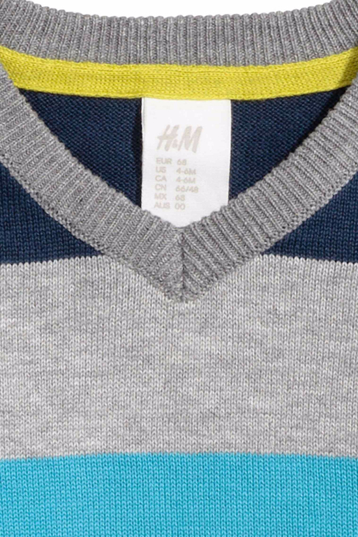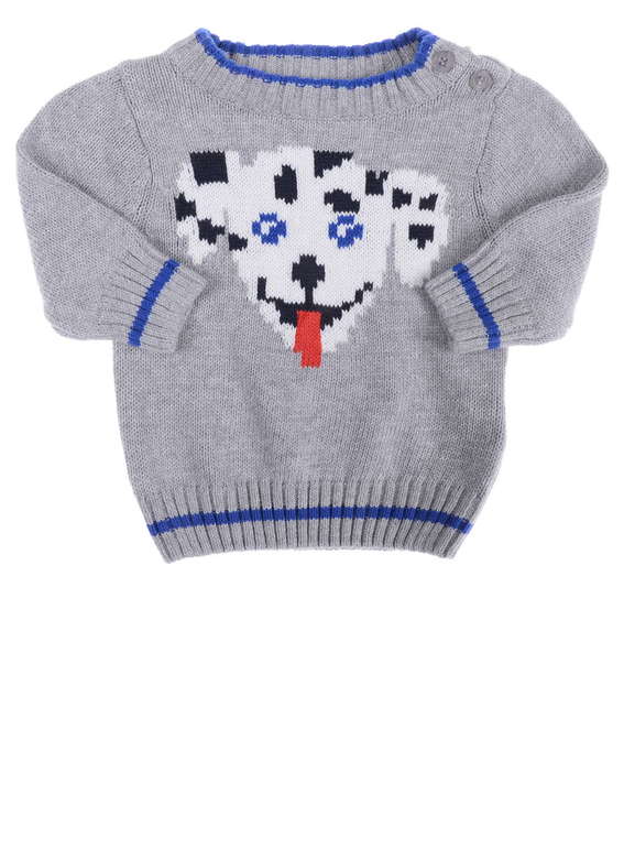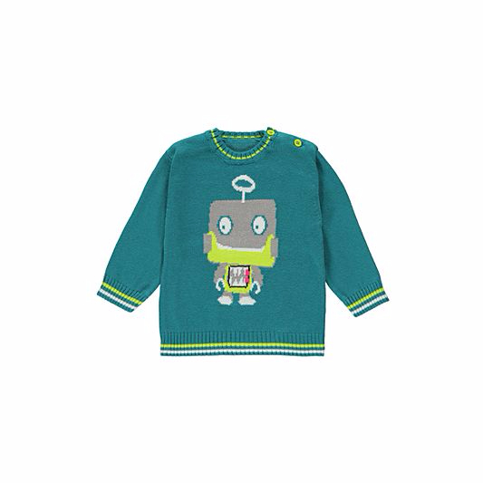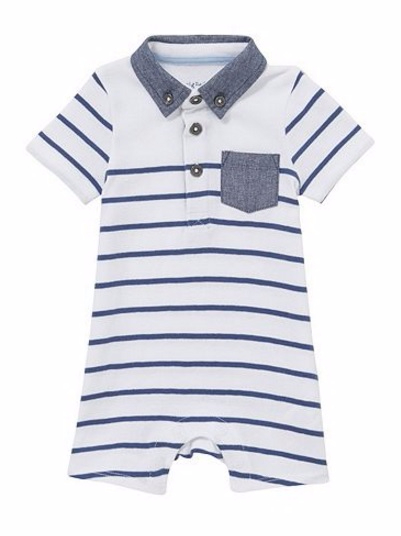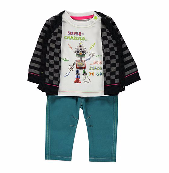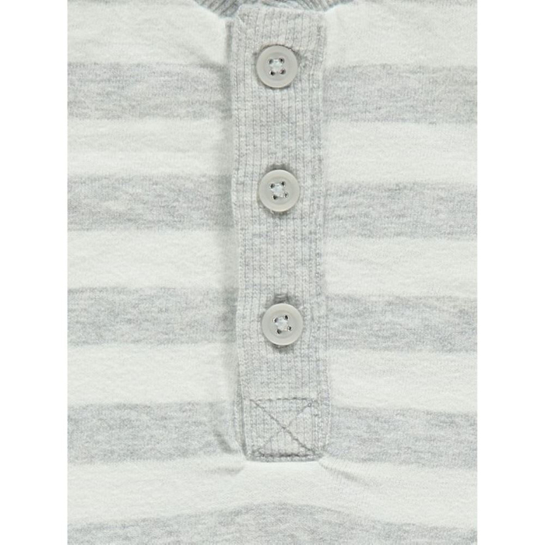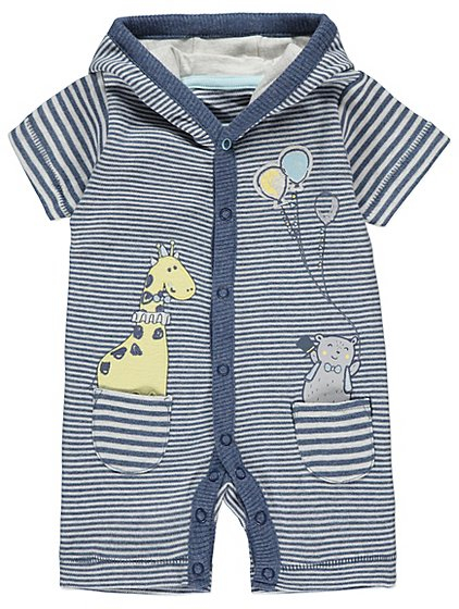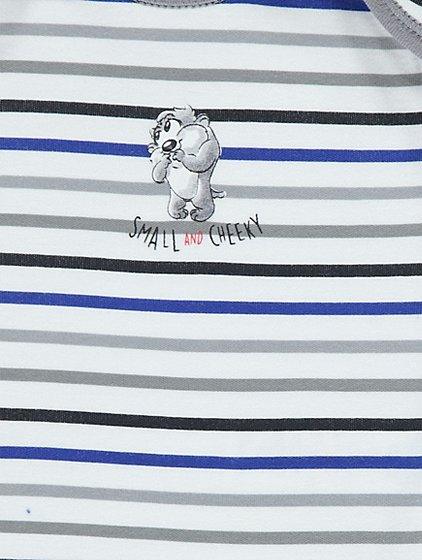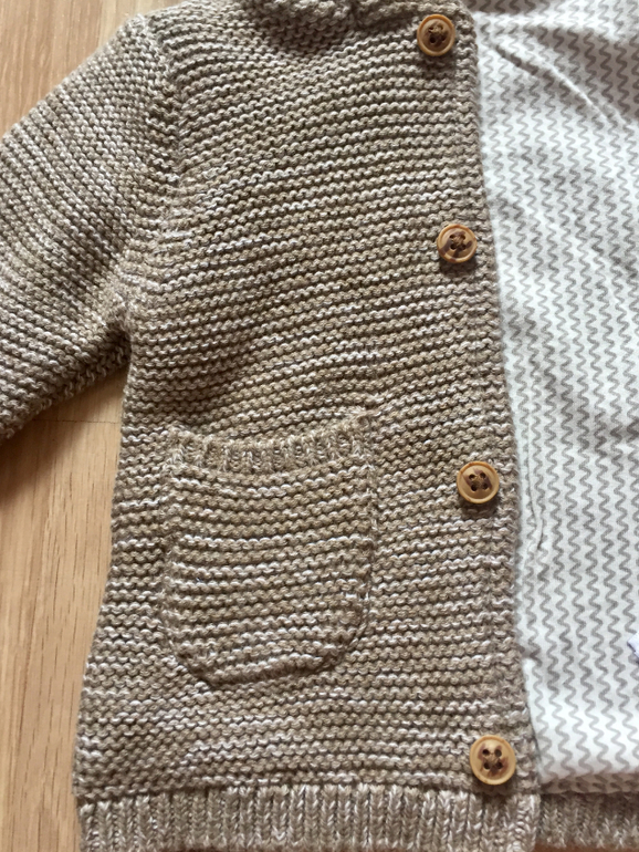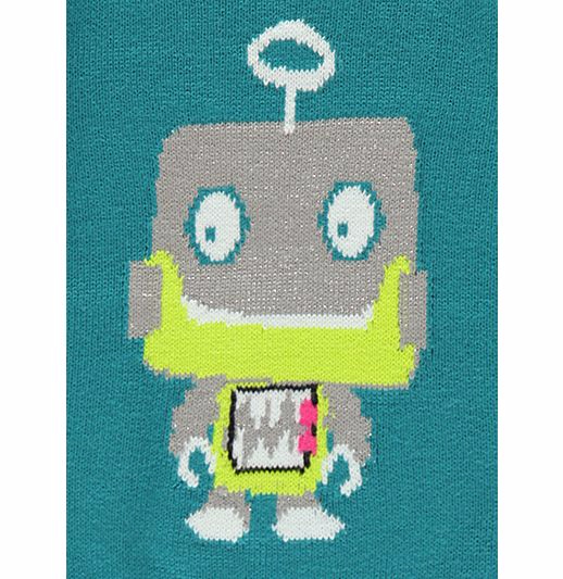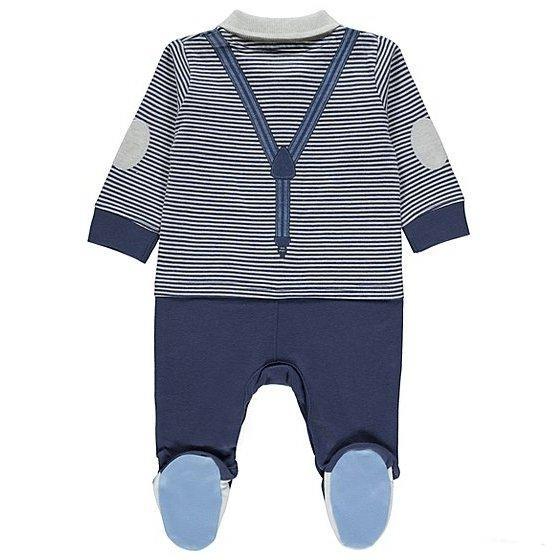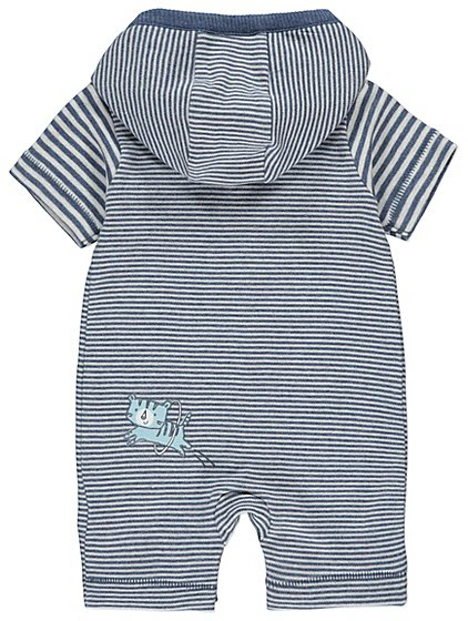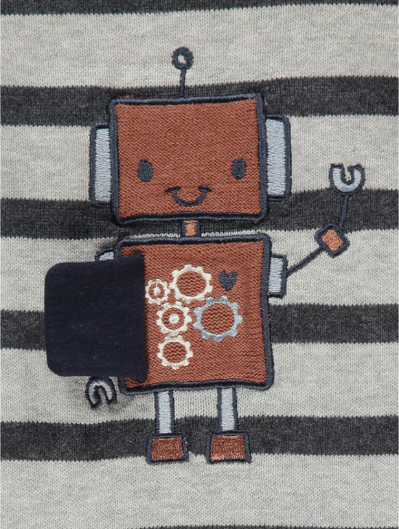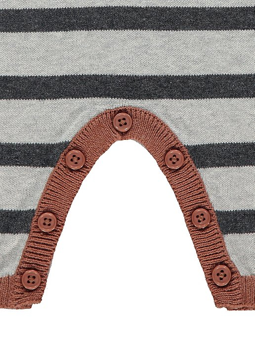 Комбинезончик Робот вязаный без ножек фирмы George. Полосатый серый с синими полосками, коричневая отделка, застегивается на кнопки между ног и на плече. Аппликация робот на груди. Состав 100% хлопок.