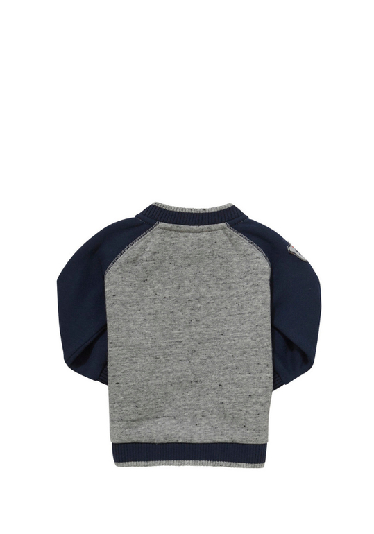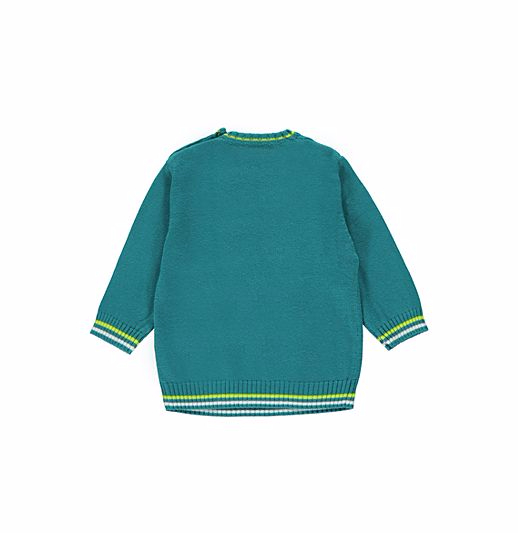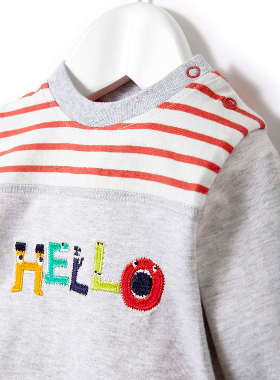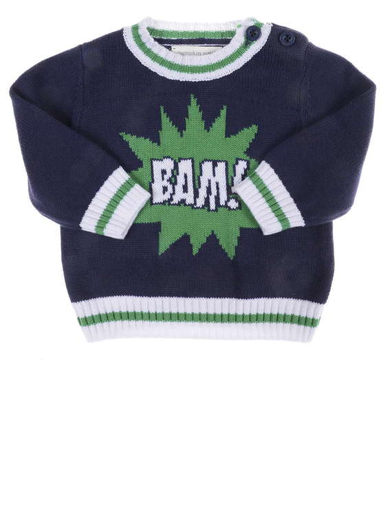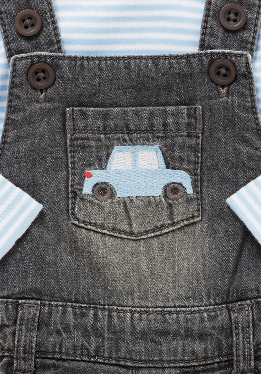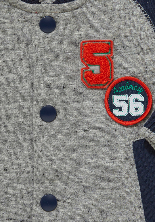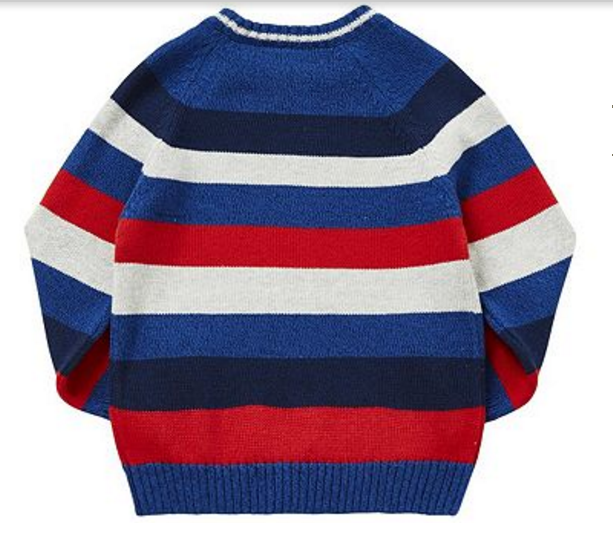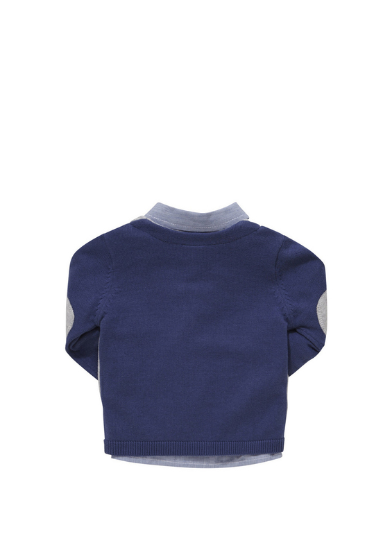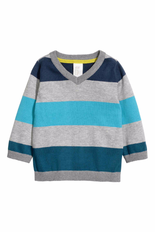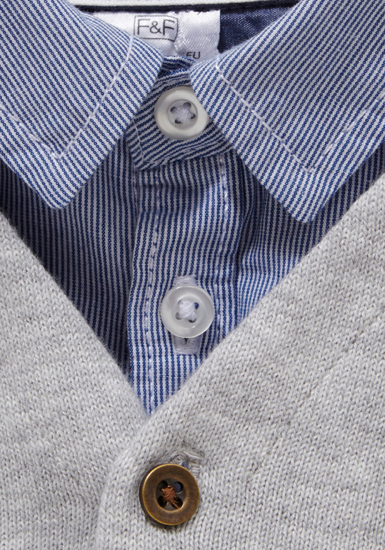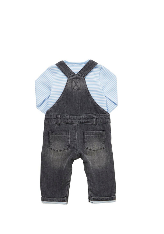 Комбинезончик Робот вязаный без ножек фирмы George. Полосатый серый с синими полосками, коричневая отделка, застегивается на кнопки между ног и на плече. Аппликация робот на груди. Состав 100% хлопок.