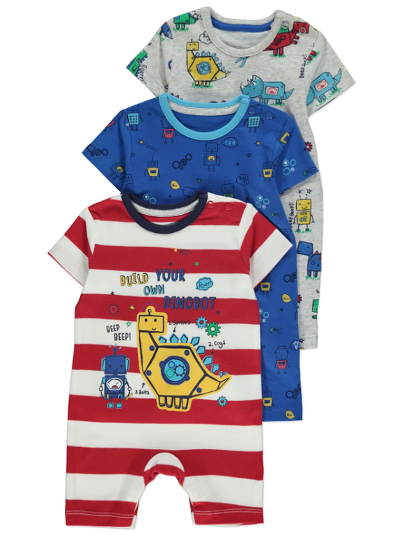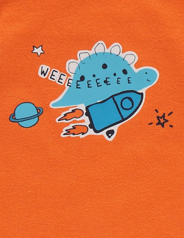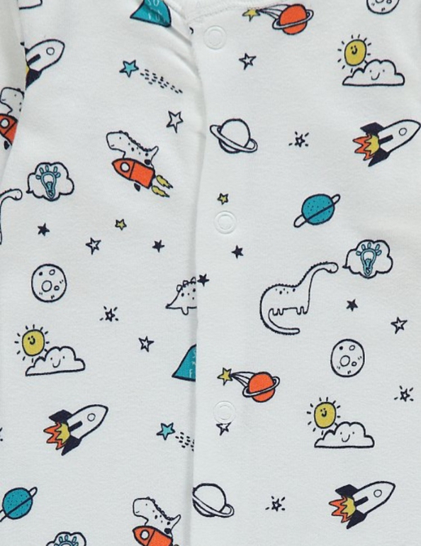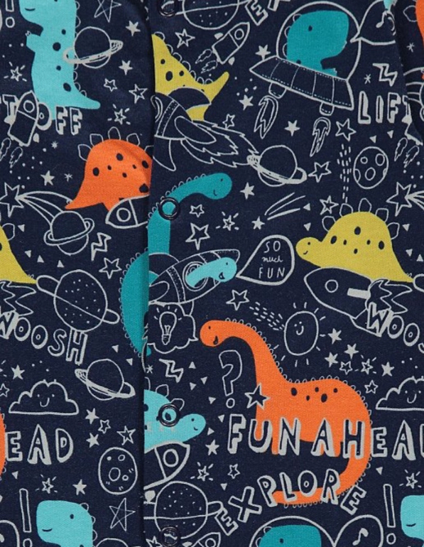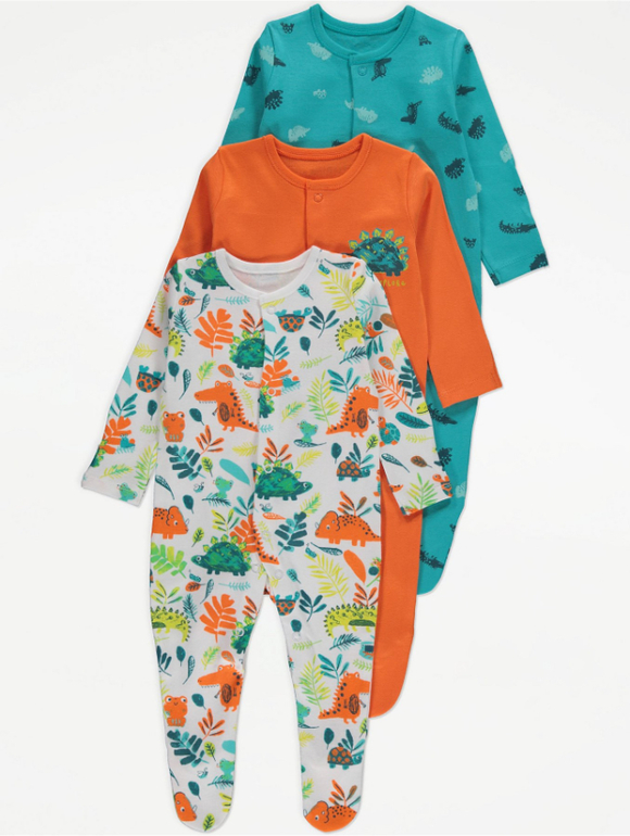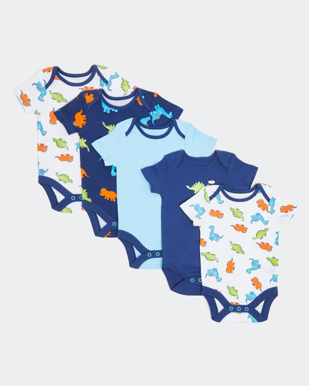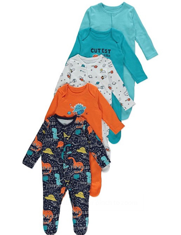 Комплект из 5х слипов Динозаврики фирмы George. Оранжевый с рисунком и голубой с рисунком застежка-кнопки только внизу между ног. Голубой без рисунка, синий с динозавриками и белый с динозавриками и ракетами - полностью расстегиваются-застегиваются на кнопках . Состав 100% хлопок,