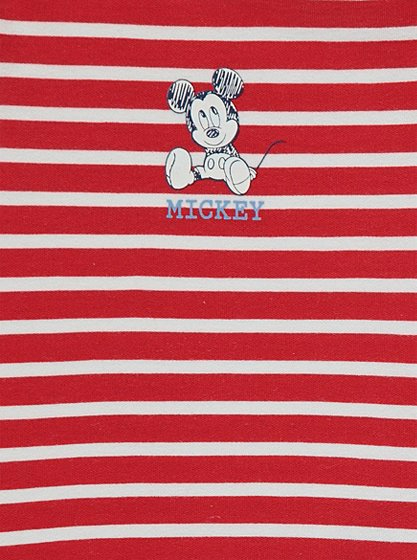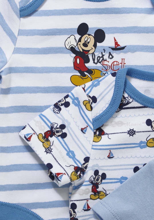 5. Комплект штанишки + боди + шапочка фирмы F&F. Бодик белый с коротким рукавом, впереди рисунок Мышка и надписи, штанишки полоска белая, голубая, желтая, серая, пояс широкая мягкая резинка + шапочка трикотажная в 1 слой с ушками. Состав 100% хлопок