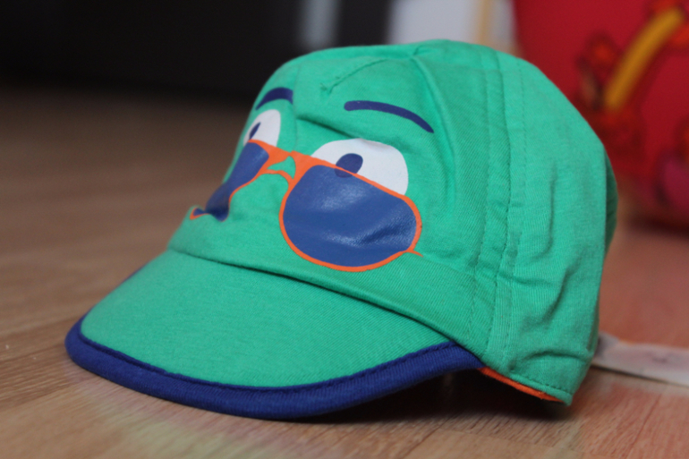 Кепка трикотаж в 2 слоя фирмы Bluezoo. Зеленая, впереди нарисованы очки, сзади кепки резиночка. Состав 100% хлопок.