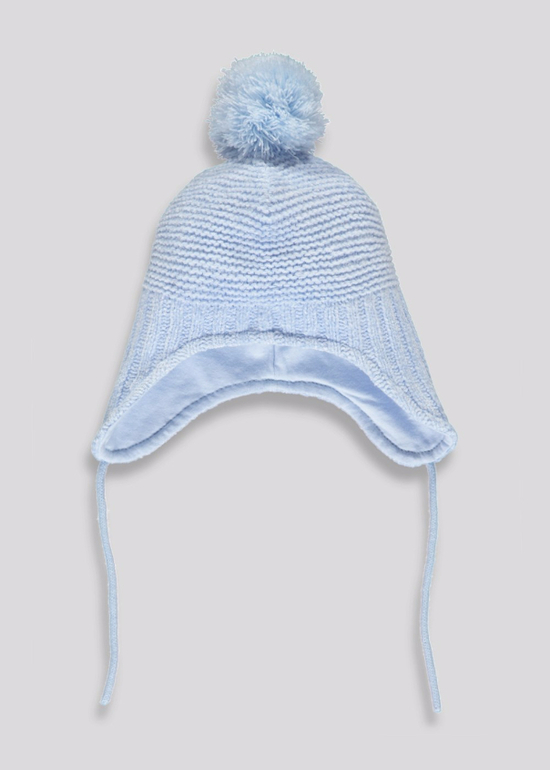 Шапочка голубая вязаная с помпоном и завязками фирмы Matalan. На теплую весну-осень, внутри на трикотажной подкладке. Состав верх 100% вискоза, подкладка 100% хлопок.