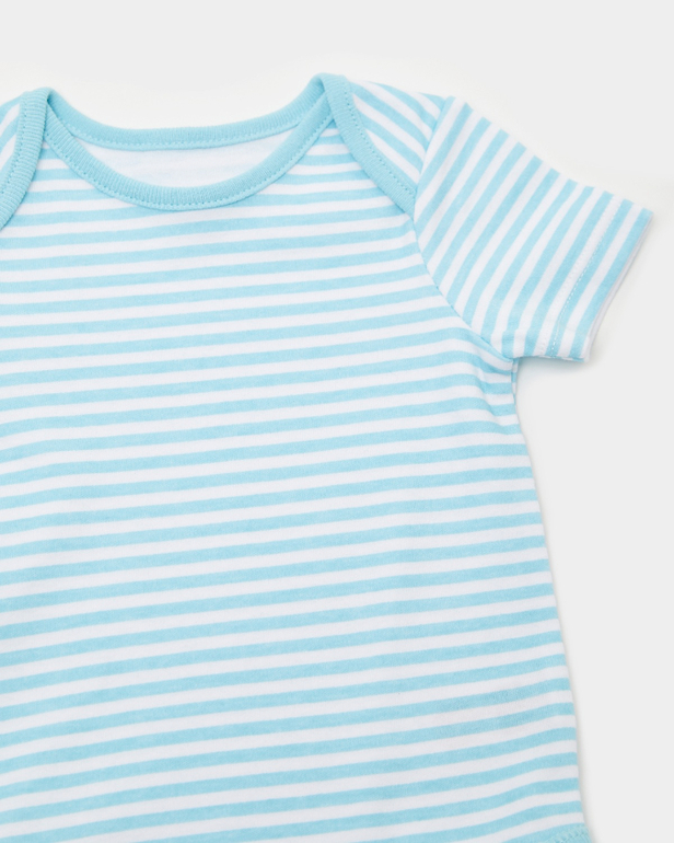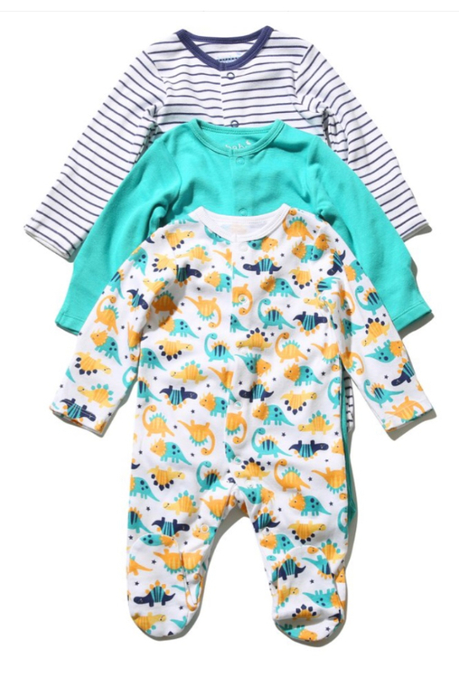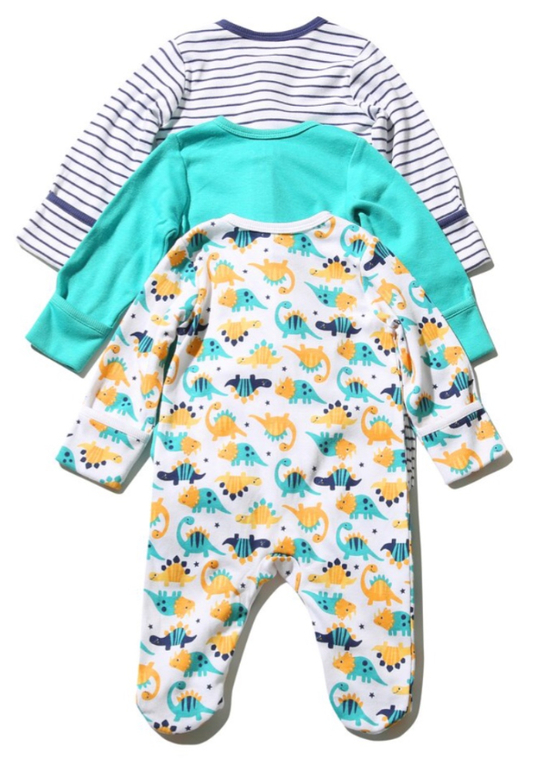 Комплект из 3х слипов фирмы M&Co. Мягкий трикотаж, полностью расстегиваются-застегиваются на кнопках, полоски белые-синие, белый с разноцветными динозавриками и бирюзовый. Состав 100% хлопок,