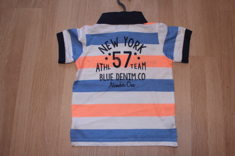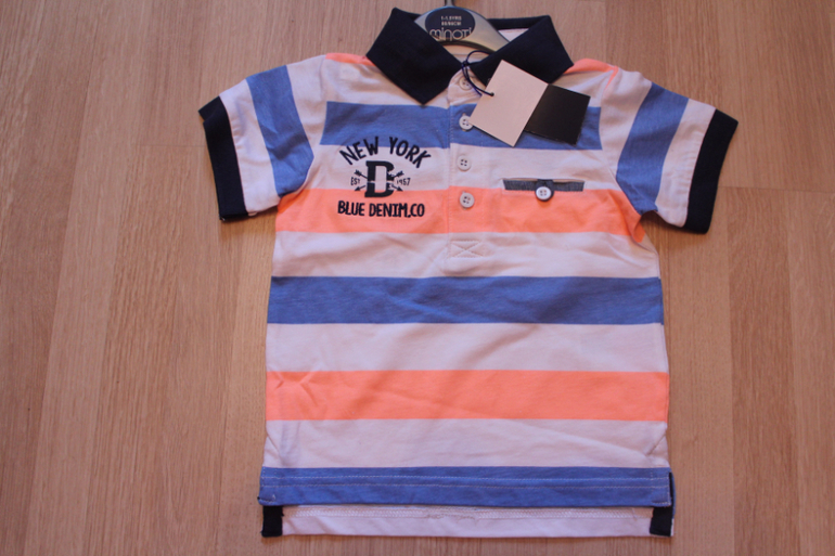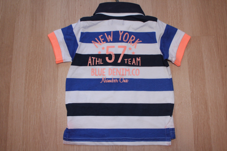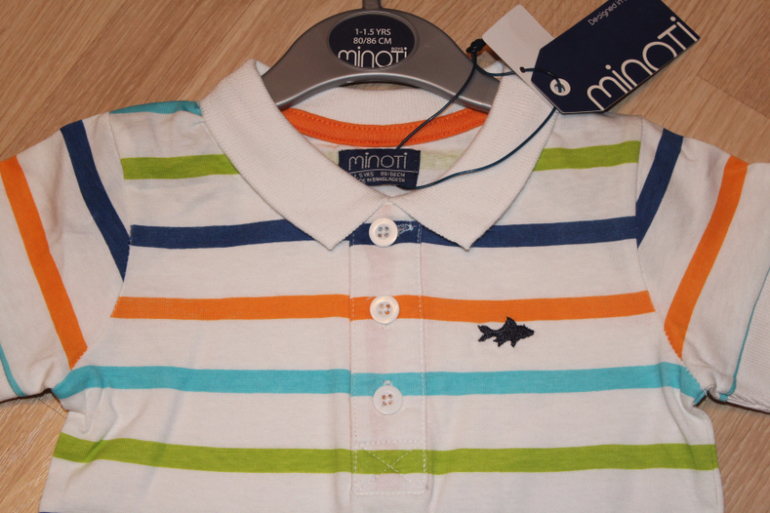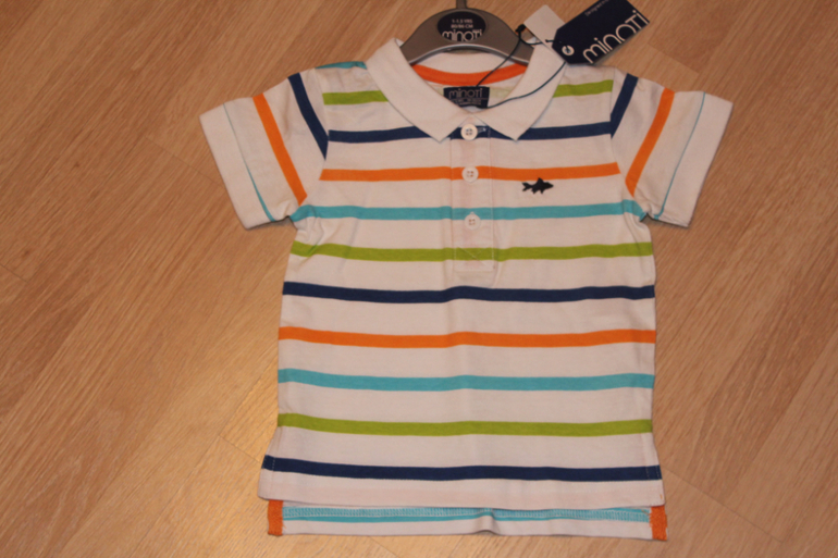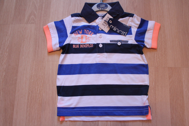 Фуболка-поло фирмы Minoti . Белая с голубыми и оранжевыми полосками, застежка 4 пуговички, на груди эмблема и кармашек, на спине рисунок. Состав 100% хлопок. Размер 12-18мес (80-86), 450руб