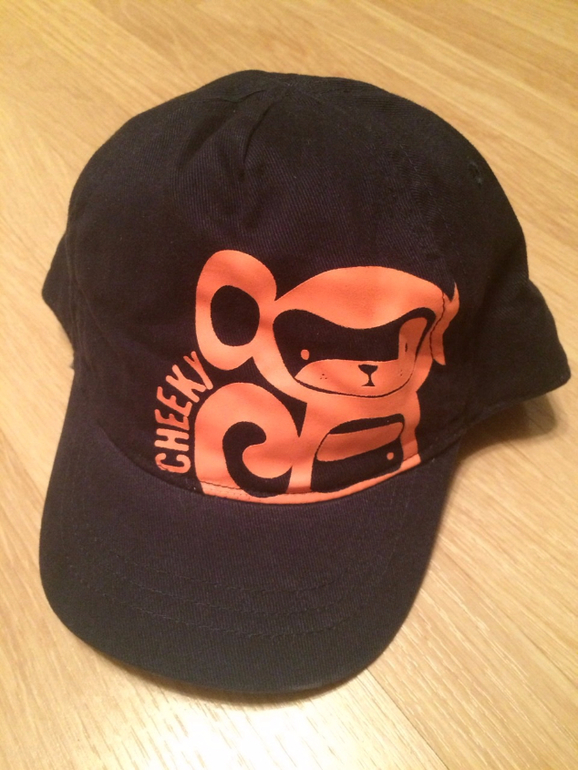 Темно-синяя, впереди Обезьянка, 100% хлопок, объем регулируется сзади липучкой.