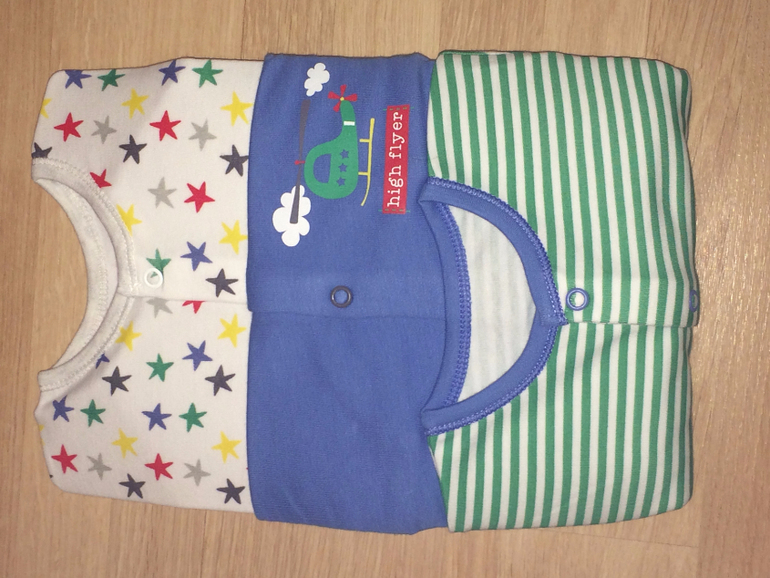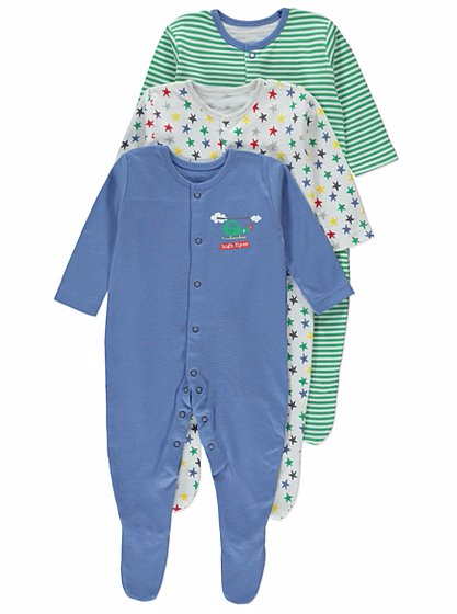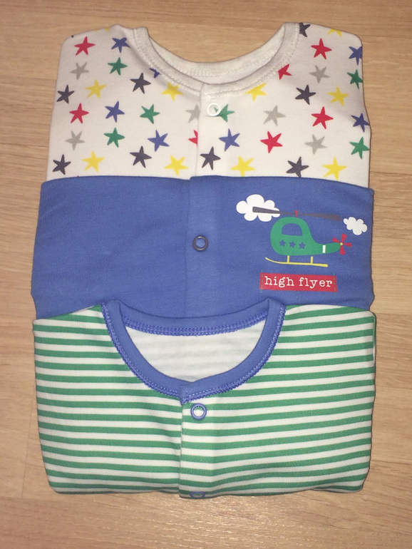 Комплект из 3х слипов фирмы George. Белые, зеленые полоски + синий с вертолетом и надписью на груди + белый с разноцветными звездочками по всему слипу. Состав 100% хлопок,