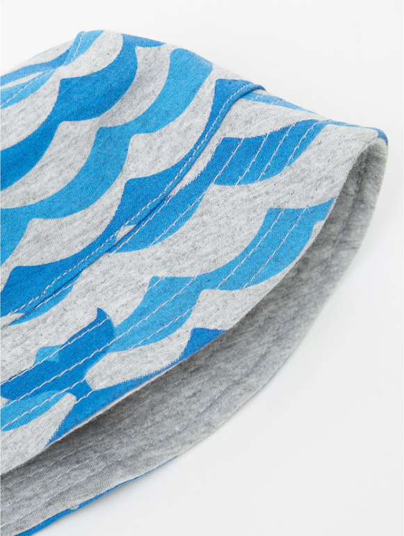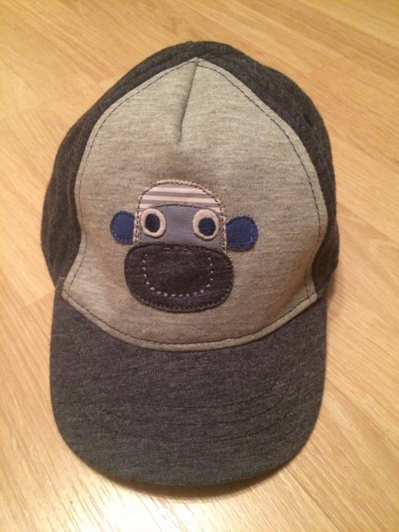 Синяя с серым, впереди Обезьянка, 100% хлопок, объем регулируется сзади липучкой.