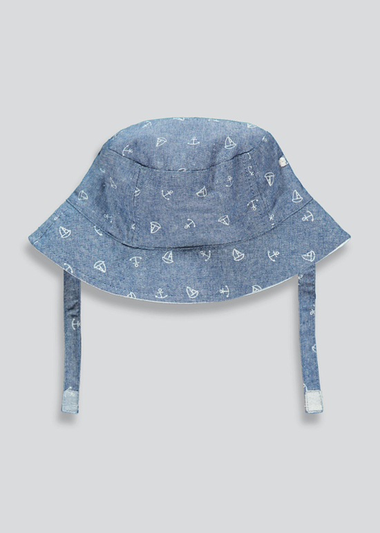 Панамка в морском стиле фирмы Matalan, цвет голубой джинсы, рисунок якоря и парусники, с широкими полями, защищающими глаза от солнца и застежка под подбородком.