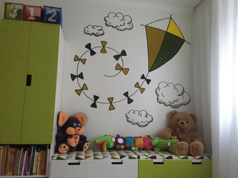 Весь интерьер изначально подбирался под икеевскую Стуву. Кровать делали на заказ, но так, чтобы "повторить" икеевский дизайн. На полу пробка, стены покрашены. Комната 12 кв.м.