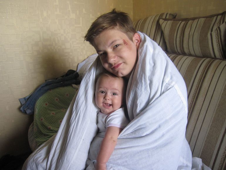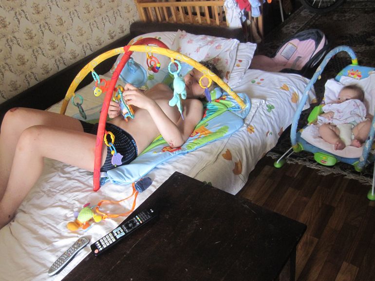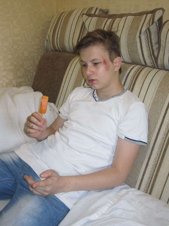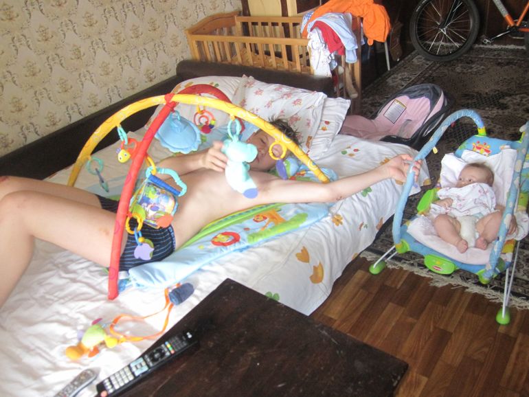 И утреннее позитивное фото, мы с Андрюшкой постоянно будим старшего брата, у нас это традиция, Андрюшка это очень любит и постоянно радуется когда видит улыбку брата! Старший очень с них хорошо общается я рада что у них такая большая любовь... Кстати сын раненный-старший.. как всегда упал с велика кувырком... это уже не первая рана за лето, было вплоть до порванных связок на ноге и гипс, ну да ладно!