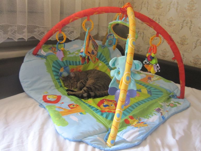 Пока налаживаю сисю, вот позитивные эмоции!! Развивающий коврик облюбовали все, кроме Андрюшки... он в нём лежит не часто и не долго, но бывает!! Попросила сына покачать в шезлонге малыша- прихожу а он лежит в развивающемся коврике и развивается изучает подвесные игрухи))) Пришла с улицы а там уже кошка лежит развивается! Все скоро станут умными и развитыми кроме Андрюшки)))