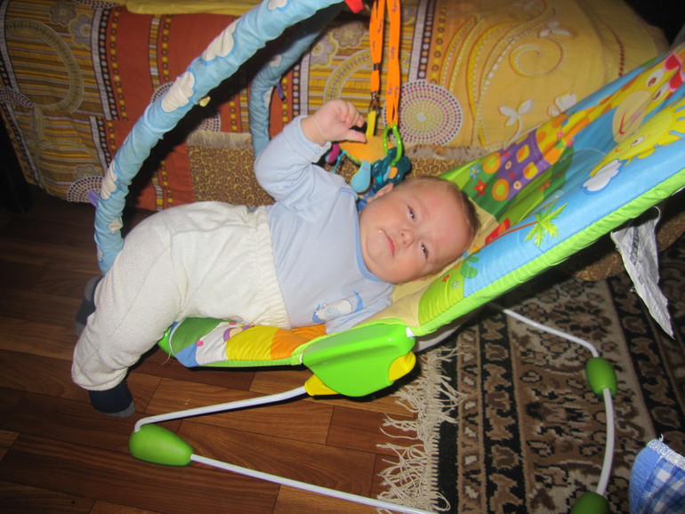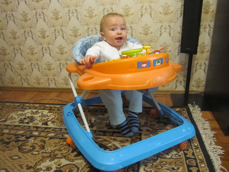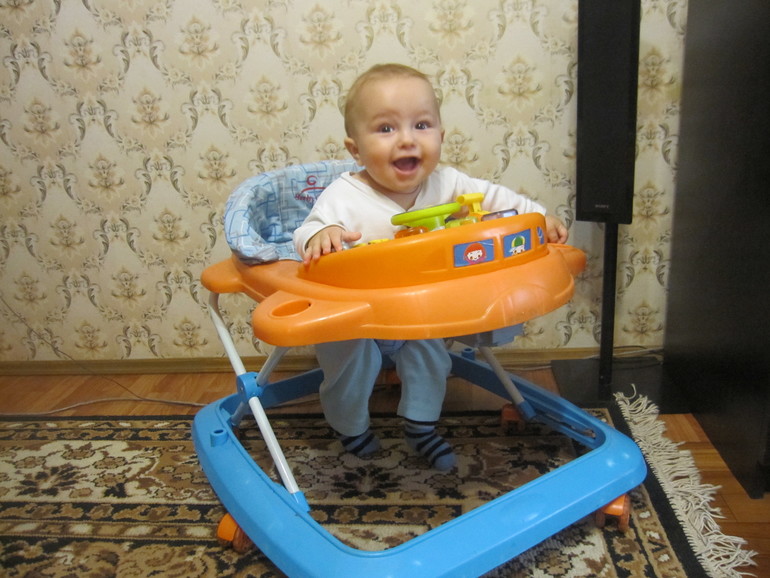 Сходили на приём к врачу вес был 7800+600 гр набор, итого-8400... рост 66+2 см, итого 68 см! Сделали прививки, вторую АКДС, даже температуры не было, только небольшое уплотнение в ноге! Зубов ещё нет, но капризничает периодически не по детски, иногда не знаешь что с ним и делать и таскаешь его и лежишь с ним и кидаешь и игрушки всякие даешь и и ..... и что только не делаешь, помогает только таскание на руках с подпрыгиваниями и пением и пританцовываем и короче!! иногда так устаёшь!! сил нет((( хоть назад засовывай(( Сон тоже не очень - ночью просыпается раза 2-3-4е... иногда так часто встаёшь что не помнишь где ребенка оставила, все по кругу то в кроватке то в шезлонге то к себе кладу усну, то опять в кроватку и тд.... один раз положила не между нами а с краю и как обычно подперла подушкой и вырубилась видимо... проснулась у него уже ноги свисают испугалась до жути... а недавно проснулась от того что он упал с шезлонга утром рано, видимо я его оставила там((не судите строго) тут же его подхватила он даже испугаться не успел и не стал плакать- только хотел, но не стал я ему дала грудь и укачала!!! Ночь как круговорот я иногда даже вспомнить не могу сколько раз он просыпался и где я его оставила...