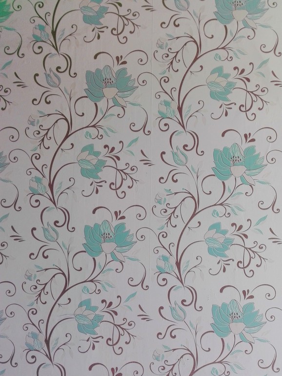 Перекрасила батареи, обновлю текстиль и ковер. Но вся загвоздка в том, что я не могу определиться с цветом. Пляшем от обоев. Они вот такие. Цветы более бирюзовые, не зеленые, фото немного искажает.
