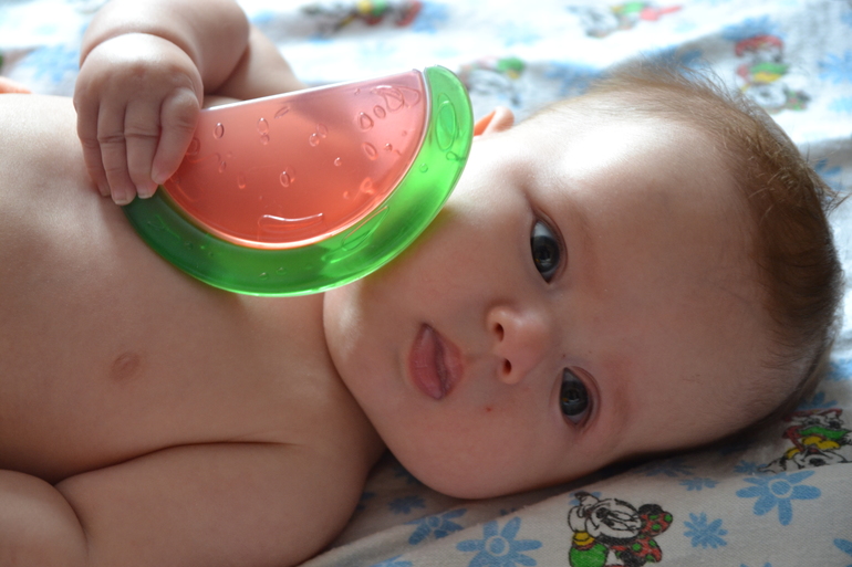 Купили Тиху первый в его жизни арбуз))прорезыватель!!!У человека лезут зубы!!))Человек счастлив))