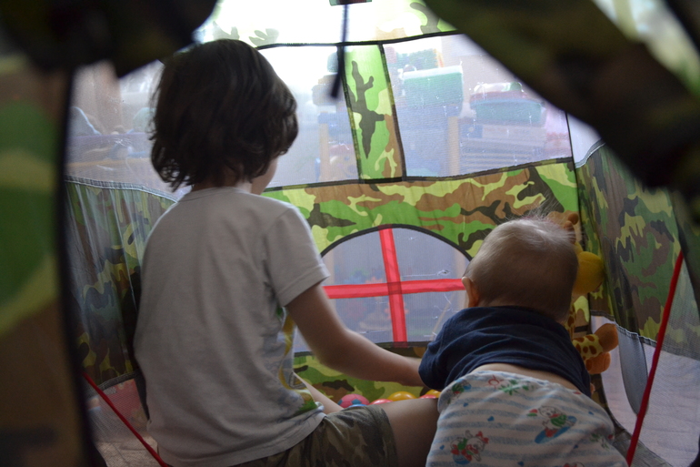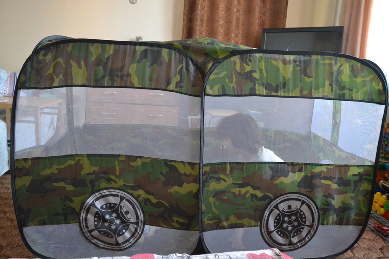 Достали мы значит, из закромов родины, то бишь с антресолей - дом-автобус...камуфляжного раскраса...военный)))Дети были рады))Можно в нем спать и вообще жить) Тихон даже в нем пописал)Многофункциональная вещь. я вам скажу) Час спокойствия эта штука создала)))