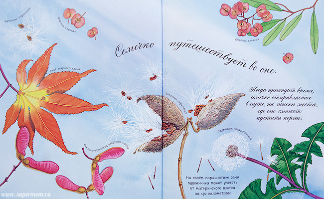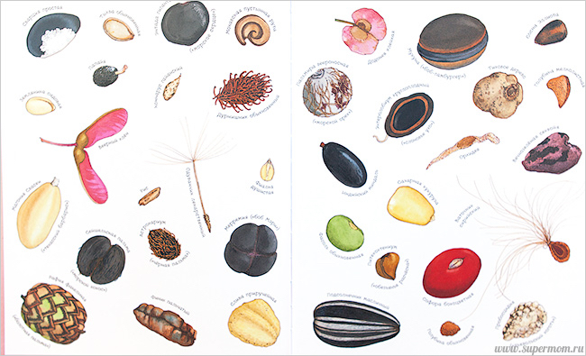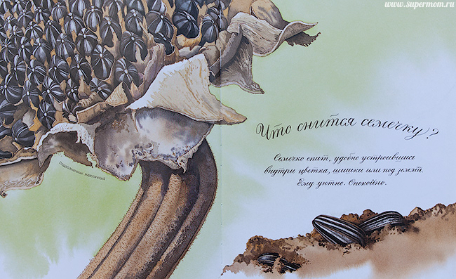 Так что, хотя книгу условно я и отнесла к энциклопедиям, назвать ее энциклопедией довольно трудно. Она красивая, даже вдохновляющая, обращает внимание на детали, которые нам, взрослым, давно незаметны. Даже такие крошечные частички, как семечки - это целый новый мир, все они разные - кого-то переносят животные на своем теле, кто-то может улететь на парашютике на 150 км, кто-то заключен внутри плода среди свежей мякоти, а кто-то с сотнями других семян сидит в сухой коробочке цветка, и в каждом из них хранится жизнь. Хотя, крошечные ли? Ведь самое большое семечко весит целых 27 кг!
