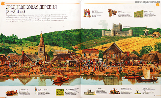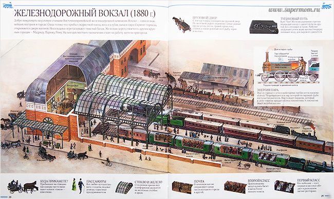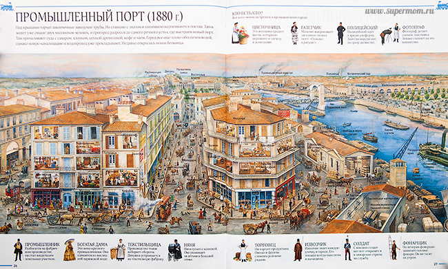 Иллюстрации очень детальные, с подписями и "в разрезе". Их хочется рассматривать снова и снова. Каждая сцена, будь то праздник в деревне или час пик в современном мегаполисе, прорисованы до мелочей.
