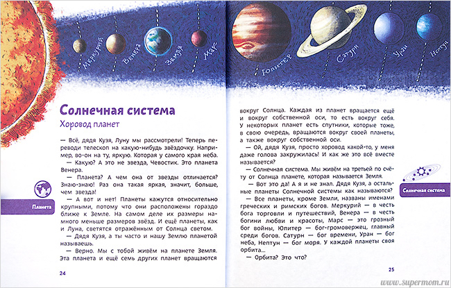 Это не книжка-картинка, в ней не так много картинок, как мы привыкли видеть в самых детских энциклопедиях. Зато текст очень детский, и при этом не делает из ребенка идиота. Диалоги и правда довольно складные. А диалоги здесь неспроста. Дело в том, что книга представлена нам как общение Чевостика - необычного героя-мальчишки, то ли чертика, то ли еще кого, с добрым дядей Кузей, который отвечает на множество вопросов и является проводником Чевостика в захватывающий мир космоса.